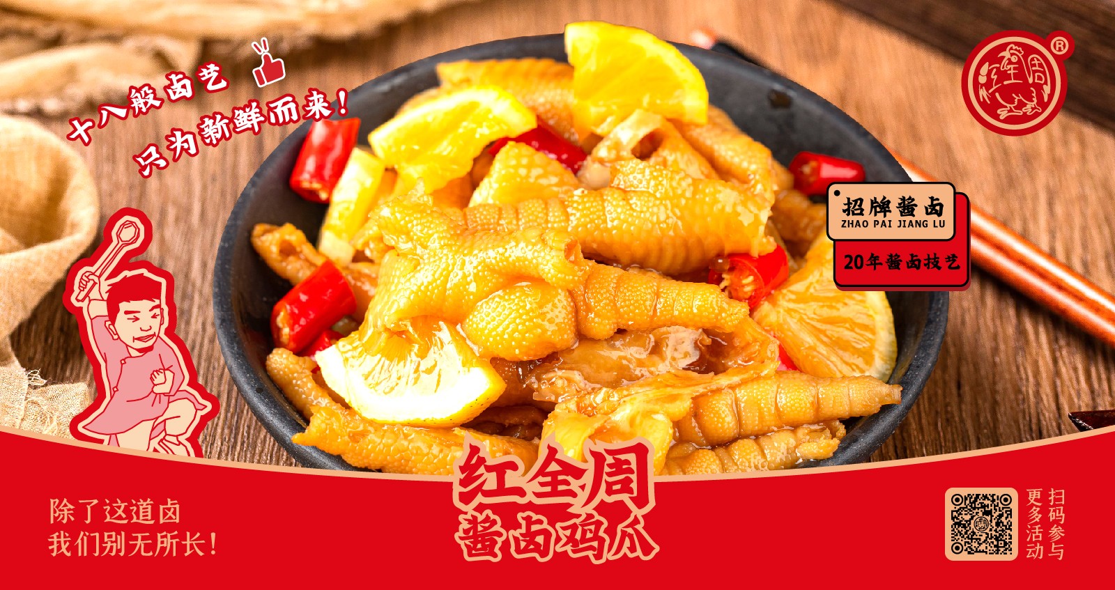 紅全周品牌創立于2012年,其生產總部坐落在以“紅全周雞爪”聞名的福建泉州市南安洪瀨鎮,經張福來師傅多年研制而成的獨家秘方,獨特的鹵制工藝,以“鮮、香、韌、辣”的特點,贏得廣大食客的交口稱贊。紅全周繼承中華美食傳統,堅持以“細微處見風范,毫厘間定乾坤”的服務準則,遵循現代健康飲食理念,精選上等食材,致力為消費者提供安全、健康的美食新體驗。